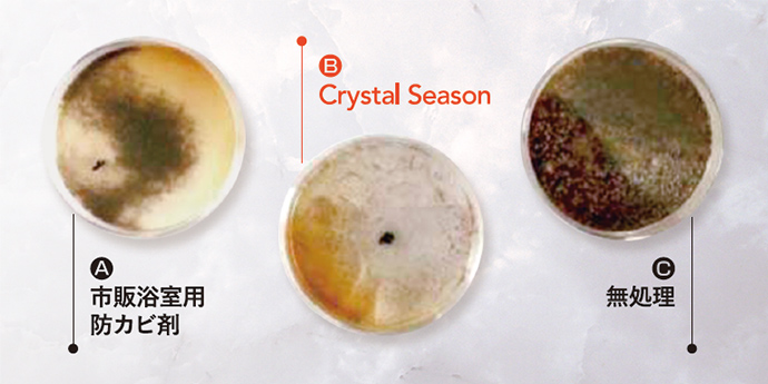 クリスタルシーズンは人体に無害で防カビ殺菌性能が飛躍的に向上した、しかも機能が長期的持続的な防カビ殺菌コーティング剤「光触媒コーティング」を使用しています。